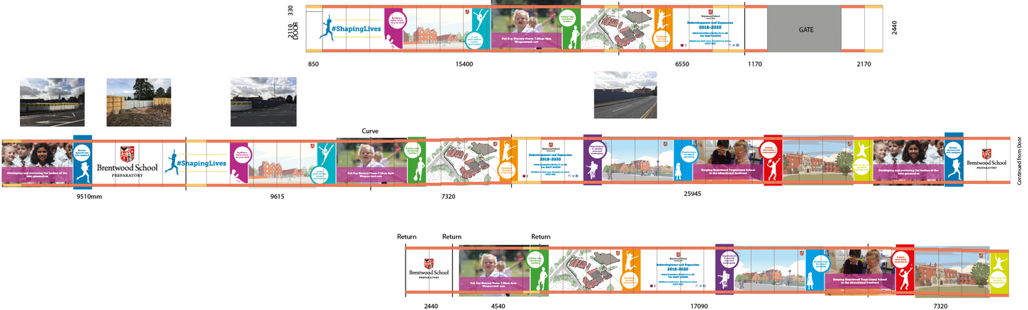 Project Scope: Create a vibrant 200m hoarding design for Brentwood Preparatory School's redevelopment project, advertise the school to prospective parents/carers and create internal communications.